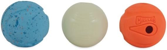 Chuckit! fetch medley includes three unique balls, each adding its own Spin to fetch for versatile and engaging play. For dogs that love to chase, the Chuckit! Whistler is equipped with four holes that emit a Whistling sound as the ball soars through the air. The Chuckit! Rebounce ball is made from natural, recycled rubber that creates high-bounce play, encouraging pets to leap and jump. For pets that are active at night, Chuckit! Max glow ball is easy to charge under bright light for illuminated playtime after dark. The fetch balls are made from natural, recycled rubber that is durable for long-term use and easy to wipe clean of dirt and slobber. Each of the balls allows high visibility for pets and pet parents, two with bright blue and orange colors and one Light up dog ball with glow-in-the-dark Pigment. The Chuckit! fetch medley is compatible with medium-sized Chuckit! launchers, enhancing fetch with slobber-free pickup and long-distance throws.